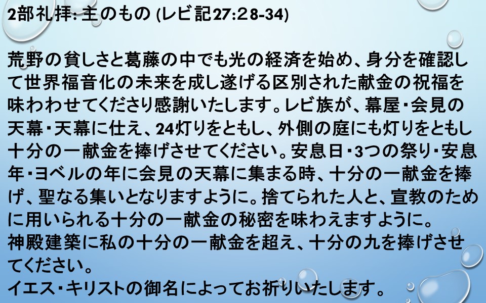 レビ族が、幕屋・会見の天幕・天幕に仕え、24灯りをともし、外側の庭にも灯りをともし十分の一献金を捧げさせてください。安息日・3つの祭り・安息年・ヨベルの年に会見の天幕に集まる時、十分の一献金を捧げ、聖なる集いとなりますように。捨てられた人と、宣教のために用いられる十分の一献金の秘密を味わえますように。神殿建築に私の十分の一献金を超え、十分の九を捧げさせてください。