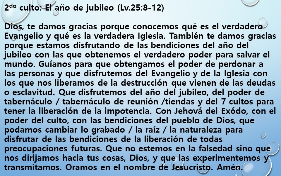 Dios, te damos gracias porque conocemos qué es el verdadero Evangelio y qué es la verdadera Iglesia. También te damos gracias porque estamos disfrutando de las bendiciones del año del jubileo con las que obtenemos el verdadero poder para salvar el mundo. Guíanos para que obtengamos el poder de perdonar a las personas y que disfrutemos del Evangelio y de la Iglesia con los que nos liberamos de la destrucción que vienen de las deudas o esclavitud. Que disfrutemos del año del jubileo, del poder de tabernáculo / tabernáculo de reunión /tiendas y del 7 cultos para tener la liberación de la impotencia. Con Jehová del Exódo, con el poder del culto, con las bendiciones del pueblo de Dios, que podamos cambiar lo grabado / la raíz / la naturaleza para disfrutar de las bendiciones de la liberación de todas preocupaciones futuras. Que no estemos en la falsedad sino que nos dirijamos hacia tus cosas, Dios, y que las experimentemos y transmitamos. Oramos en el nombre de Jesucristo. Amén.