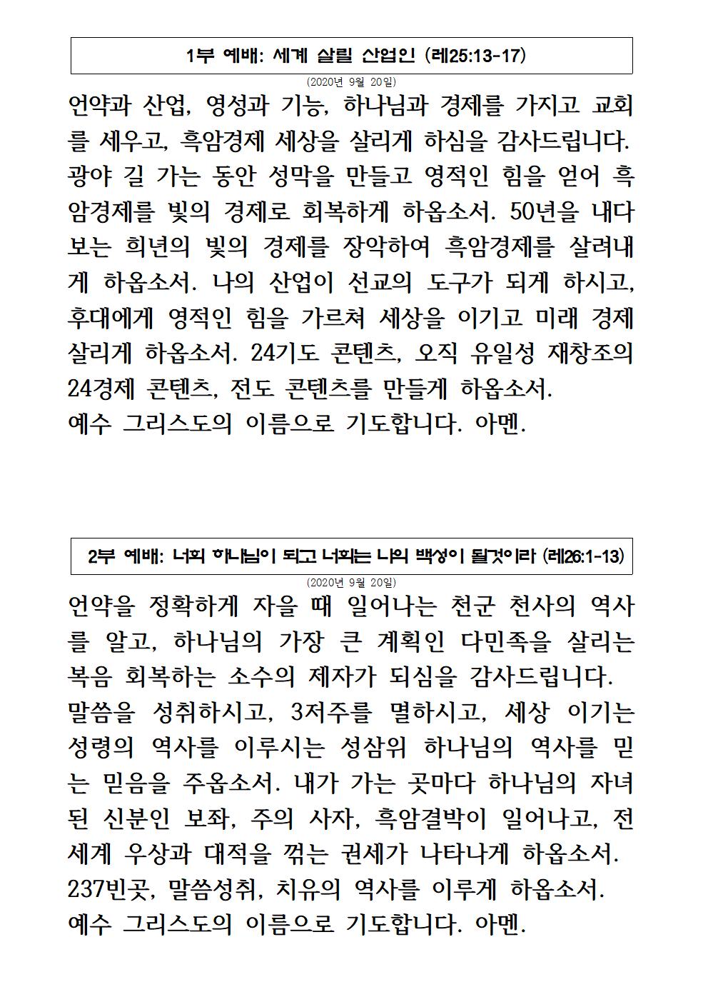 2020년 9월 20일 주일예배 기도제목 – 한국어