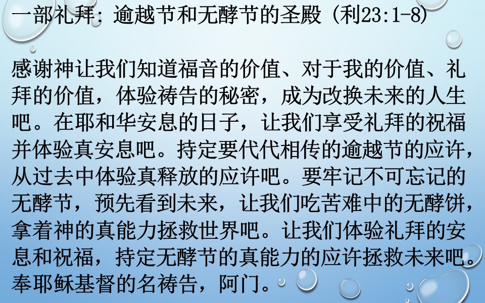 感谢神让我们知道福音的价值、对于我的价值、礼拜的价值,体验祷告的秘密,成为改换未来的人生吧。在耶和华安息的日子,让我们享受礼拜的祝福并体验真安息吧。持定要代代相传的逾越节的应许,从过去中体验真释放的应许吧。要牢记不可忘记的无酵节,预先看到未来,让我们吃苦难中的无酵饼,拿着神的真能力拯救世界吧。让我们体验礼拜的安息和祝福,持定无酵节的真能力的应许拯救未来吧。奉耶稣基督的名祷告,阿门。