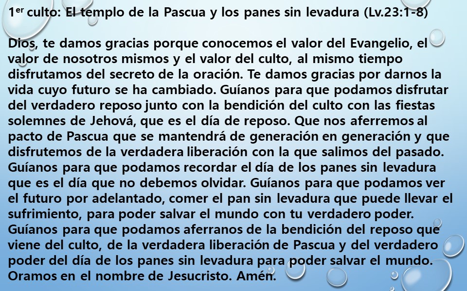 Dios, te damos gracias porque conocemos el valor del Evangelio, el valor de nosotros mismos y el valor del culto, al mismo tiempo disfrutamos del secreto de la oración. Te damos gracias por darnos la vida cuyo futuro se ha cambiado. Guíanos para que podamos disfrutar del verdadero reposo junto con la bendición del culto con las fiestas solemnes de Jehová, que es el día de reposo. Que nos aferremos al pacto de Pascua que se mantendrá de generación en generación y que disfrutemos de la verdadera liberación con la que salimos del pasado. Guíanos para que podamos recordar el día de los panes sin levadura que es el día que no debemos olvidar. Guíanos para que podamos ver el futuro por adelantado, comer el pan sin levadura que puede llevar el sufrimiento, para poder salvar el mundo con tu verdadero poder. Guíanos para que podamos aferranos de la bendición del reposo que viene del culto, de la verdadera liberación de Pascua y del verdadero poder del día de los panes sin levadura para poder salvar el mundo. Oramos en el nombre de Jesucristo. Amén.
