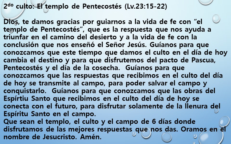 Dios, te damos gracias por guiarnos a la vida de fe con “el templo de Pentecostés”, que es la respuesta que nos ayuda a triunfar en el camino del desierto y a la vida de fe con la conclusión que nos enseñó el Señor Jesús. Guíanos para que conozcamos que este tiempo que damos el culto en el día de hoy cambia el destino y para que disfrutemos del pacto de Pascua, Pentecostés y el día de la cosecha.