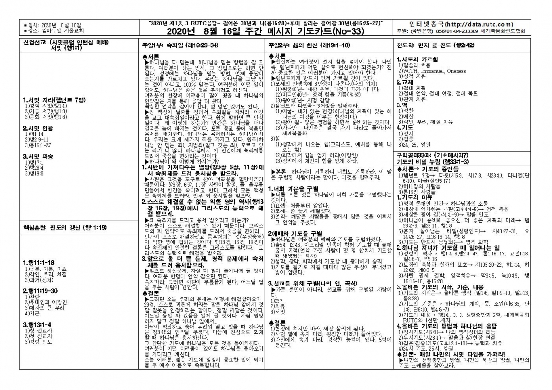 2020년 8월 16일 주일예배 메시지 기도카드