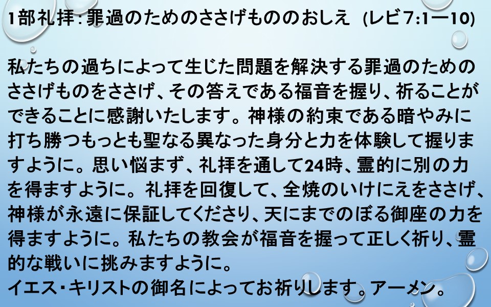 私たちの過ちによって生じた問題を解決する罪過のためのささげものをささげ、その答えである福音を握り、祈ることができることに感謝いたします。