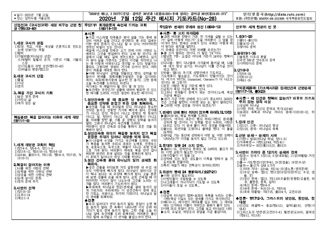 2020년 7월 12일 주일예배 메시지 기도카드