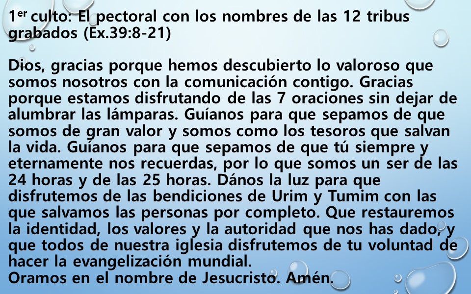 Guíanos para que sepamos de que somos de gran valor y somos como los tesoros que salvan la vida. Guíanos para que sepamos de que tú siempre y eternamente nos recuerdas, por lo que somos un ser de las 24 horas y de las 25 horas. Dános la luz para que disfrutemos de las bendiciones de Urim y Tumim con las que salvamos las personas por completo. Que restauremos la identidad, los valores y la autoridad que nos has dado, y que todos de nuestra iglesia disfrutemos de tu voluntad de hacer la evangelización mundial. Oramos en el nombre de Jesucristo. Amén.