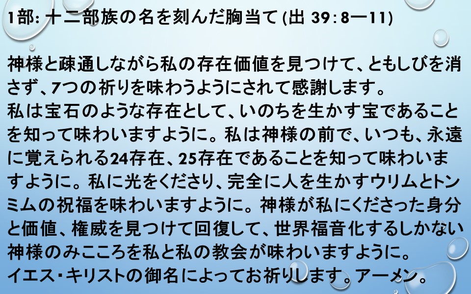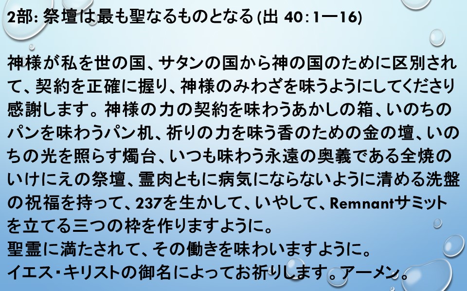 神様の力の契約を味わうあかしの箱、いのちのパンを味わうパン机、祈りの力を味う香のための金の壇、いのちの光を照らす燭台、いつも味わう永遠の奥義である全焼のいけにえの祭壇、霊肉ともに病気にならないように清める洗盤の祝福を持って、237を生かして、いやして、Remnantサミットを立てる三つの枠を作りますように。