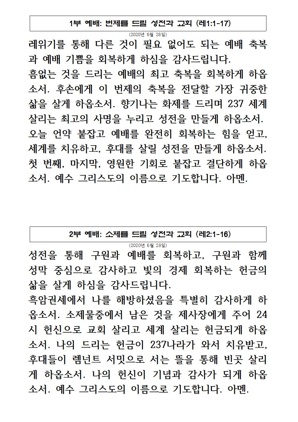 2020년 6월 28일 주일예배 기도제목 – 한국어