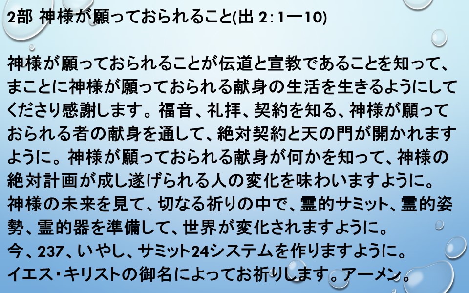 福音、礼拝、契約を知る、神様が願っておられる者の献身を通して、絶対契約と天の門が開かれますように。