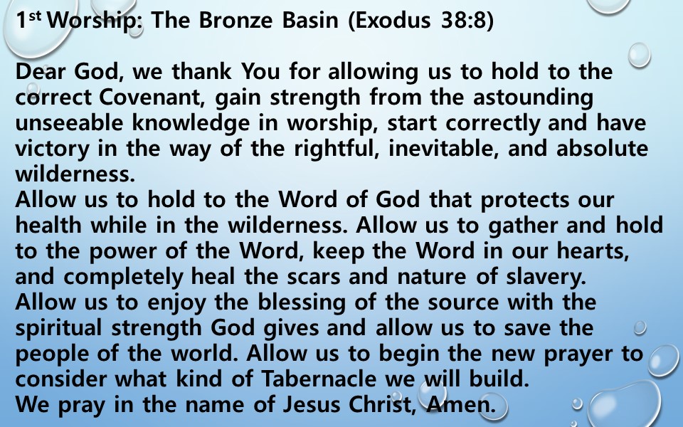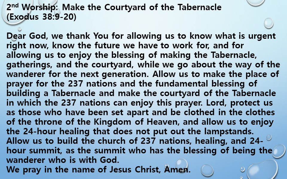 Allow us to make the place of prayer for the 237 nations and the fundamental blessing of building a Tabernacle and make the courtyard of the Tabernacle in which the 237 nations can enjoy this prayer.