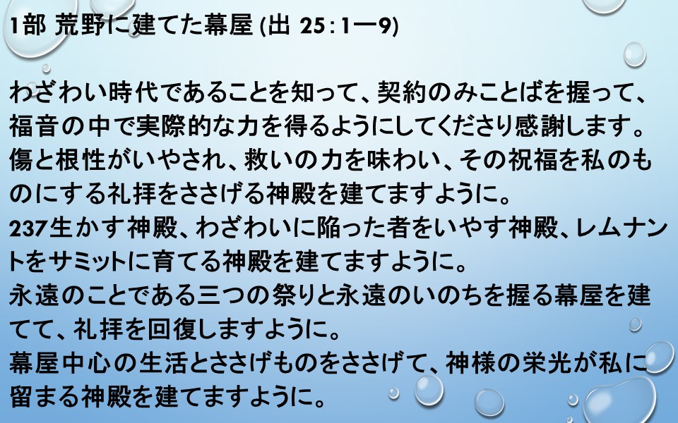 237生かす神殿、わざわいに陥った者をいやす神殿、レムナントをサミットに育てる神殿を建てますように。