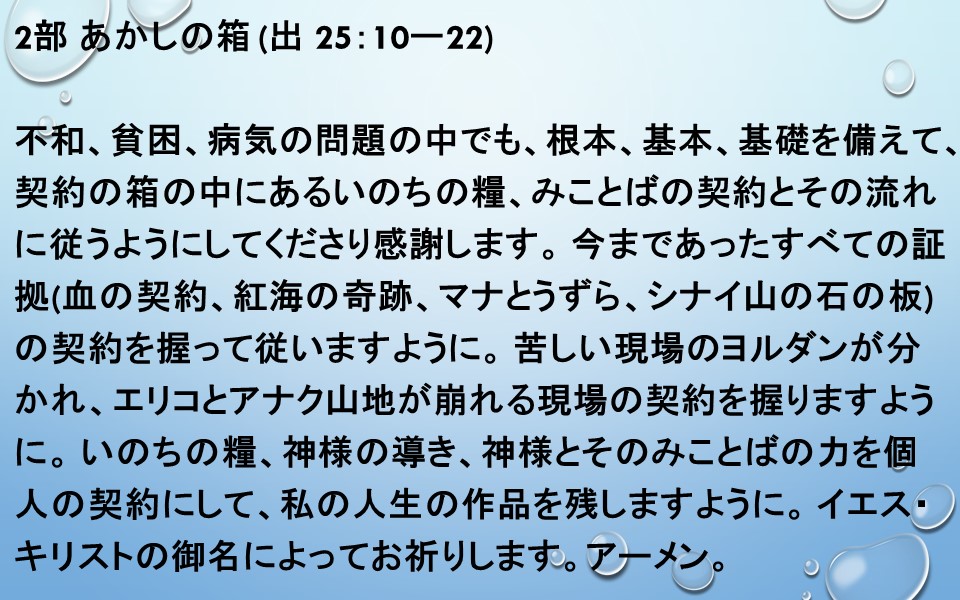 不和、貧困、病気の問題の中でも、根本、基本、基礎を備えて、契約の箱の中にあるいのちの糧、みことばの契約とその流れに従うようにしてくださり感謝します。