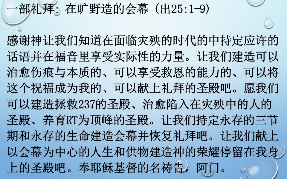 让我们建造可以治愈伤痕与本质的、可以享受救恩的能力的、可以将这个祝福成为我的、可以献上礼拜的圣殿吧。愿我们可以建造拯救237的圣殿、治愈陷入在灾殃中的人的圣殿、养育RT为顶峰的圣殿。