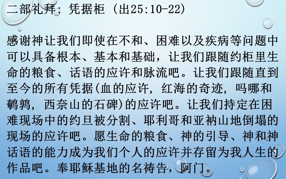 感谢神让我们即使在不和、困难以及疾病等问题中可以具备根本、基本和基础,让我们跟随约柜里生命的粮食、话语的应许和脉流吧。