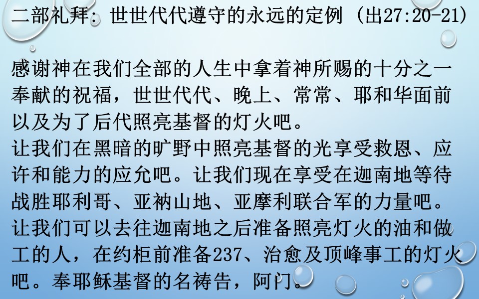 二部礼拜: 世世代代遵守的永远的定例 (出27:20-21)