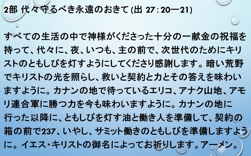 2部 代々守るべき永遠のおきて (出 27:20ー21)