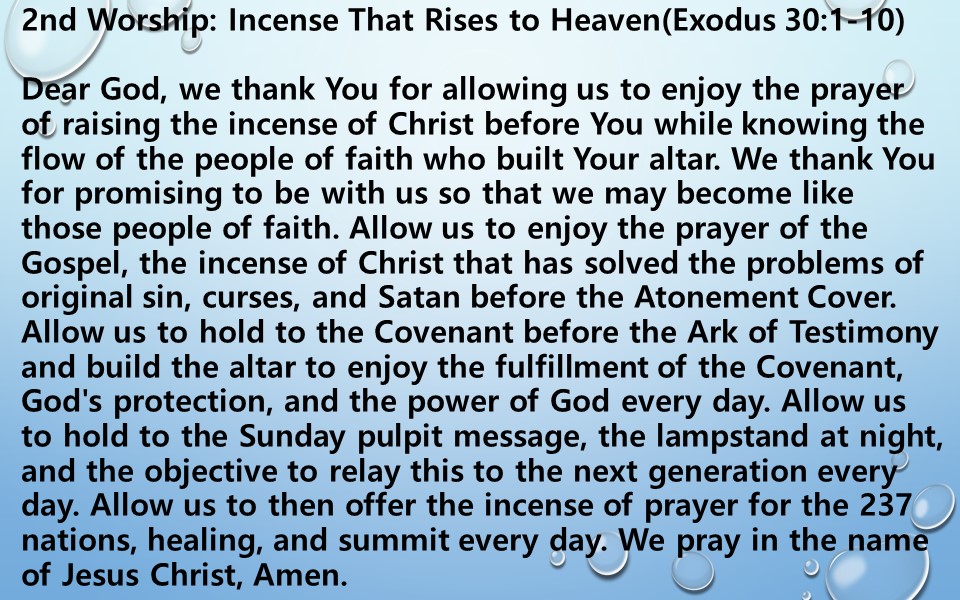Dear God, we thank You for allowing us to enjoy the prayer of raising the incense of Christ before You while knowing the flow of the people of faith who built Your altar. We thank You for promising to be with us so that we may become like those people of faith. Allow us to enjoy the prayer of the Gospel, the incense of Christ that has solved the problems of original sin, curses, and Satan before the Atonement Cover. Allow us to hold to the Covenant before the Ark of Testimony and build the altar to enjoy the fulfillment of the Covenant, God's protection, and the power of God every day. Allow us to hold to the Sunday pulpit message, the lampstand at night, and the objective to relay this to the next generation every day. Allow us to then offer the incense of prayer for the 237 nations, healing, and summit every day. We pray in the name of Jesus Christ, Amen.