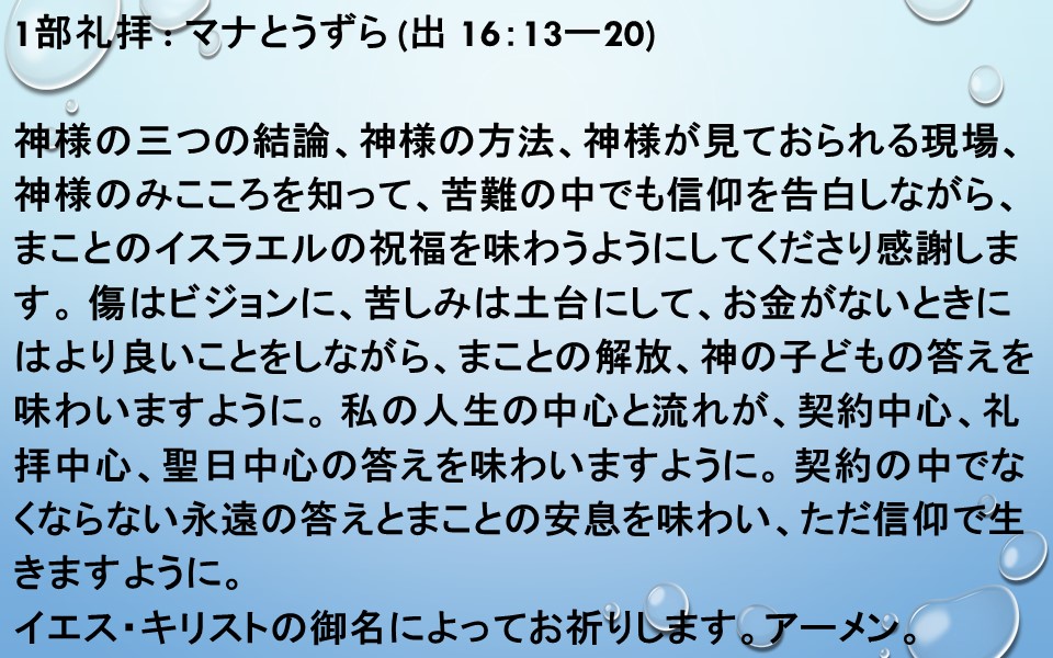 1部礼拝 : マナとうずら(出 16:13ー20)