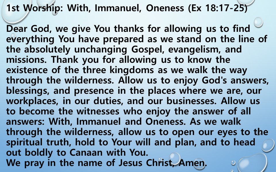 Dear God, we give You thanks for allowing us to find everything You have prepared as we stand on the line of the absolutely unchanging Gospel, evangelism, and missions. Thank you for allowing us to know the existence of the three kingdoms as we walk the way through the wilderness. Allow us to enjoy God's answers, blessings, and presence in the places where we are, our workplaces, in our duties, and our businesses. Allow us to become the witnesses who enjoy the answer of all answers: With, Immanuel and Oneness. As we walk through the wilderness, allow us to open our eyes to the spiritual truth, hold to Your will and plan, and to head out boldly to Canaan with You.