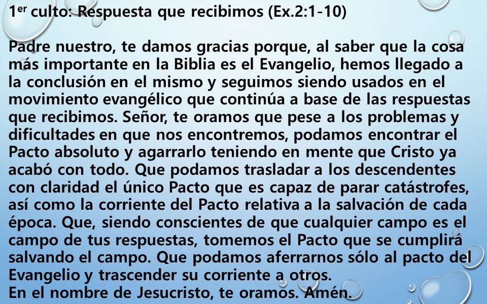Señor, te oramos que pese a los problemas y dificultades en que nos encontremos, podamos encontrar el Pacto absoluto y agarrarlo teniendo en mente que Cristo ya acabó con todo. Que podamos trasladar a los descendentes con claridad el único Pacto que es capaz de parar catástrofes, así como la corriente del Pacto relativa a la salvación de cada época. Que, siendo conscientes de que cualquier campo es el campo de tus respuestas, tomemos el Pacto que se cumplirá salvando el campo. Que podamos aferrarnos sólo al pacto del Evangelio y trascender su corriente a otros.