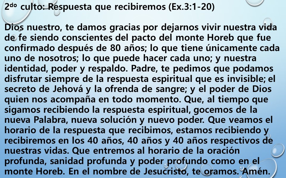 Padre, te pedimos que podamos disfrutar siempre de la respuesta espiritual que es invisible; el secreto de Jehová y la ofrenda de sangre; y el poder de Dios quien nos acompaña en todo momento. Que, al tiempo que sigamos recibiendo la respuesta espiritual, gocemos de la nueva Palabra, nueva solución y nuevo poder. Que veamos el horario de la respuesta que recibimos, estamos recibiendo y recibiremos en los 40 años, 40 años y 40 años respectivos de nuestras vidas. Que entremos al horario de la oración profunda, sanidad profunda y poder profundo como en el monte Horeb.