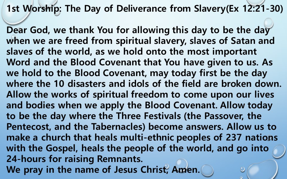 Dear God, we thank You for allowing this day to be the day when we are freed from spiritual slavery, slaves of Satan and slaves of the world, as we hold onto the most important Word and the Blood Covenant that You have given to us. As we hold to the Blood Covenant, may today first be the day where the 10 disasters and idols of the field are broken down. Allow the works of spiritual freedom to come upon our lives and bodies when we apply the Blood Covenant. Allow today to be the day where the Three Festivals (the Passover, the Pentecost, and the Tabernacles) become answers. Allow us to make a church that heals multi-ethnic peoples of 237 nations with the Gospel, heals the people of the world, and go into 24-hours for raising Remnants.