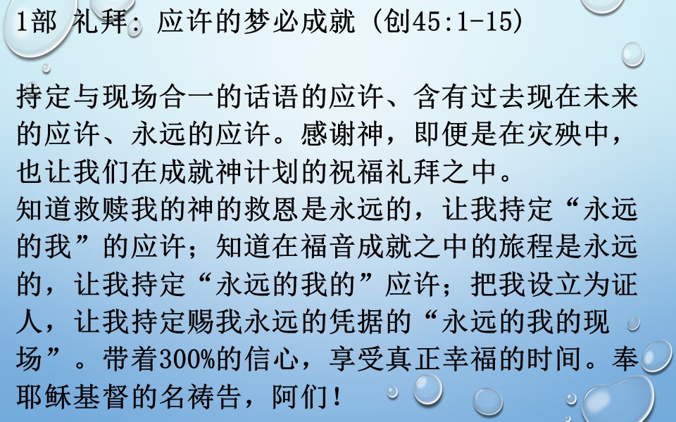持定与现场合一的话语的应许、含有过去现在未来的应许、永远的应许。感谢神,即便是在灾殃中,也让我们在成就神计划的祝福礼拜之中。