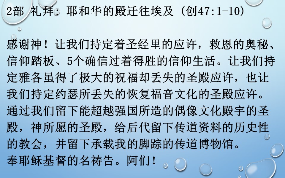 2部 礼拜: 耶和华的殿迁往埃及 (创47:1-10)