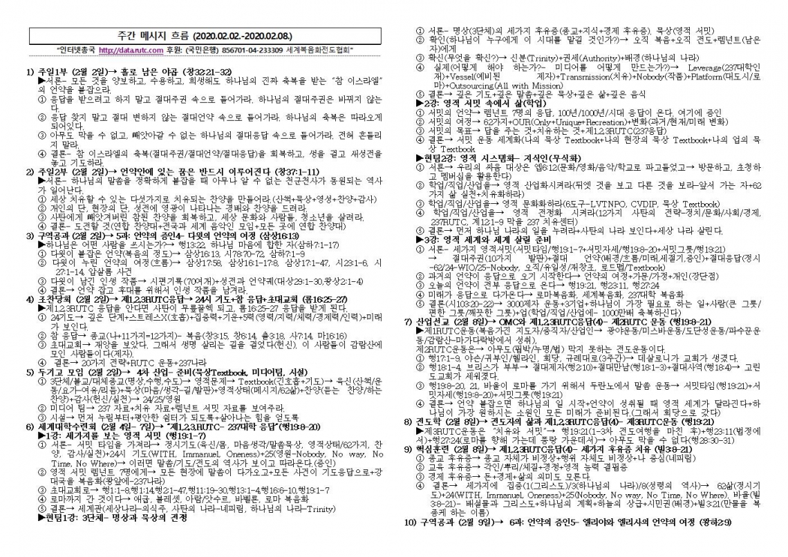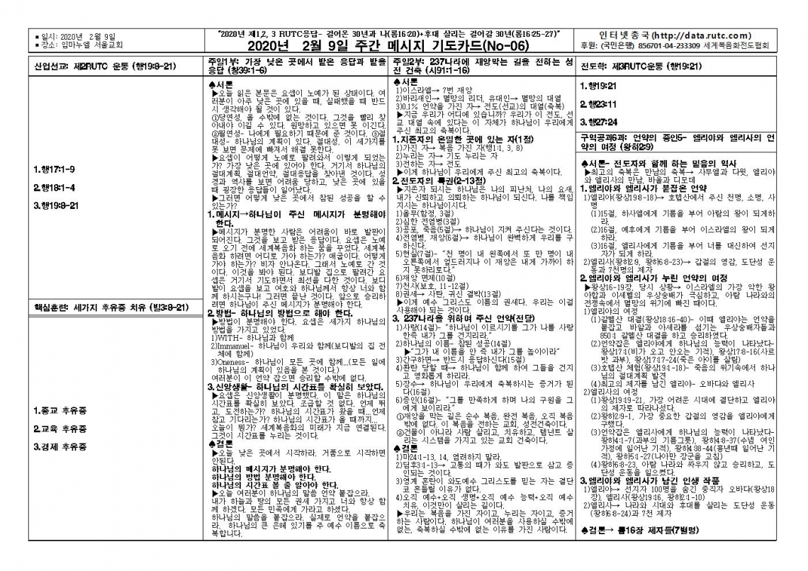 2020년 2월 9일 주일예배 메시지 기도카드