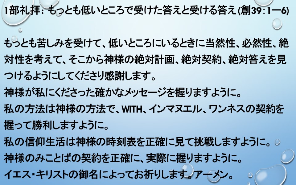 もっとも苦しみを受けて、低いところにいるときに当然性、必然性、絶対性を考えて、そこから神様の絶対計画、絶対契約、絶対答えを見つけるようにしてくださり感謝します。