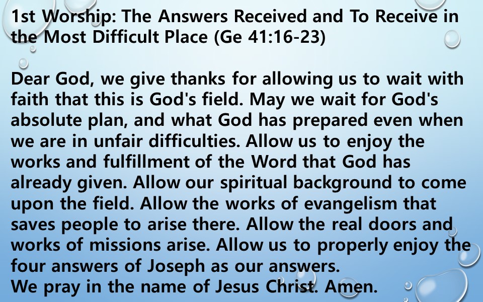 Dear God, we give thanks for allowing us to wait with faith that this is God's field. May we wait for God's absolute plan, and what God has prepared even when we are in unfair difficulties. Allow us to enjoy the works and fulfillment of the Word that God has already given. Allow our spiritual background to come upon the field. Allow the works of evangelism that saves people to arise there. Allow the real doors and works of missions arise. Allow us to properly enjoy the four answers of Joseph as our answers.