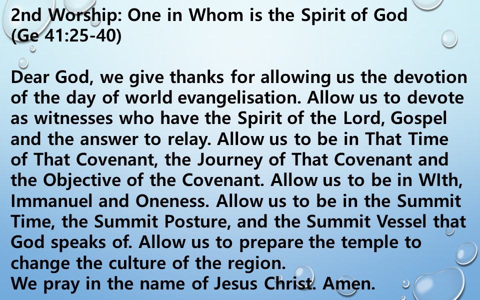 Dear God, we give thanks for allowing us the devotion of the day of world evangelisation. Allow us to devote as witnesses who have the Spirit of the Lord, Gospel and the answer to relay. Allow us to be in That Time of That Covenant, the Journey of That Covenant and the Objective of the Covenant. Allow us to be in WIth, Immanuel and Oneness. Allow us to be in the Summit Time, the Summit Posture, and the Summit Vessel that God speaks of. Allow us to prepare the temple to change the culture of the region.