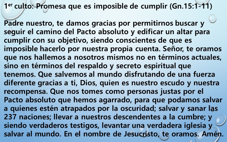 Señor, te oramos que nos hallemos a nosotros mismos no en términos actuales, sino en términos del respaldo y secreto espiritual que tenemos. Que salvemos al mundo disfrutando de una fuerza diferente gracias a ti, Dios, quien es nuestro escudo y nuestra recompensa. Que nos tomes como personas justas por el Pacto absoluto que hemos agarrado, para que podamos salvar a quienes estén atrapados por la oscuridad; salvar y sanar las 237 naciones; llevar a nuestros descendentes a la cumbre; y siendo verdaderos testigos, levantar una verdadera iglesia y salvar al mundo.