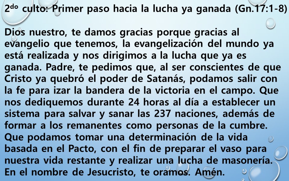 Padre, te pedimos que, al ser conscientes de que Cristo ya quebró el poder de Satanás, podamos salir con la fe para izar la bandera de la victoria en el campo. Que nos dediquemos durante 24 horas al día a establecer un sistema para salvar y sanar las 237 naciones, además de formar a los remanentes como personas de la cumbre. Que podamos tomar una determinación de la vida basada en el Pacto, con el fin de preparar el vaso para nuestra vida restante y realizar una lucha de masonería.