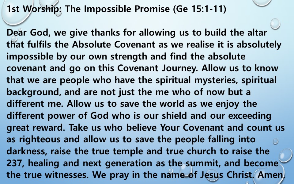 Dear God, we give thanks for allowing us to build the altar that fulfils the Absolute Covenant as we realise it is absolutely impossible by our own strength and find the absolute covenant and go on this Covenant Journey. Allow us to know that we are people who have the spiritual mysteries, spiritual background, and are not just the me who of now but a different me. Allow us to save the world as we enjoy the different power of God who is our shield and our exceeding great reward. Take us who believe Your Covenant and count us as righteous and allow us to save the people falling into darkness, raise the true temple and true church to raise the 237, healing and next generation as the summit, and become the true witnesses.