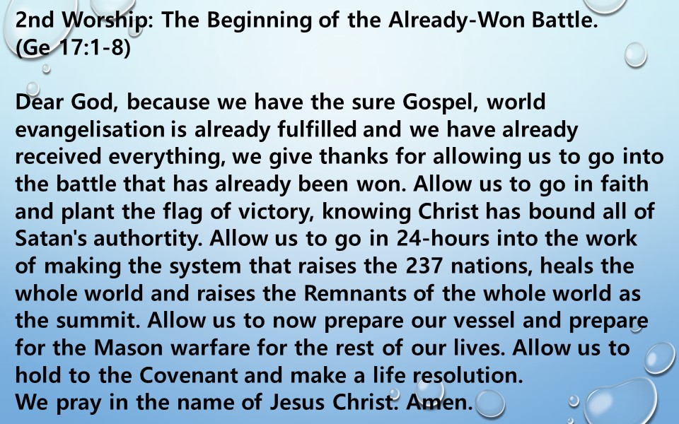 Dear God, because we have the sure Gospel, world evangelisation is already fulfilled and we have already received everything, we give thanks for allowing us to go into the battle that has already been won. Allow us to go in faith and plant the flag of victory, knowing Christ has bound all of Satan's authortity. Allow us to go in 24-hours into the work of making the system that raises the 237 nations, heals the whole world and raises the Remnants of the whole world as the summit. Allow us to now prepare our vessel and prepare for the Mason warfare for the rest of our lives. Allow us to hold to the Covenant and make a life resolution.