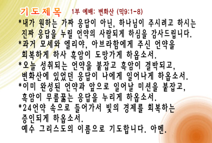 내가 원하는 가짜 응답이 아닌, 하나님이 주시려고 하시는 진짜 응답을 누릴 언약의 사람되게 하심을 감사드립니다. 과거 모세와 엘리야, 아브라함에게 주신 언약을 회복하게 하사 흑암이 도망가게 하옵소서.