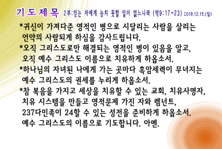 2019년 12월 15일 주일예배 기도제목 – 한국어