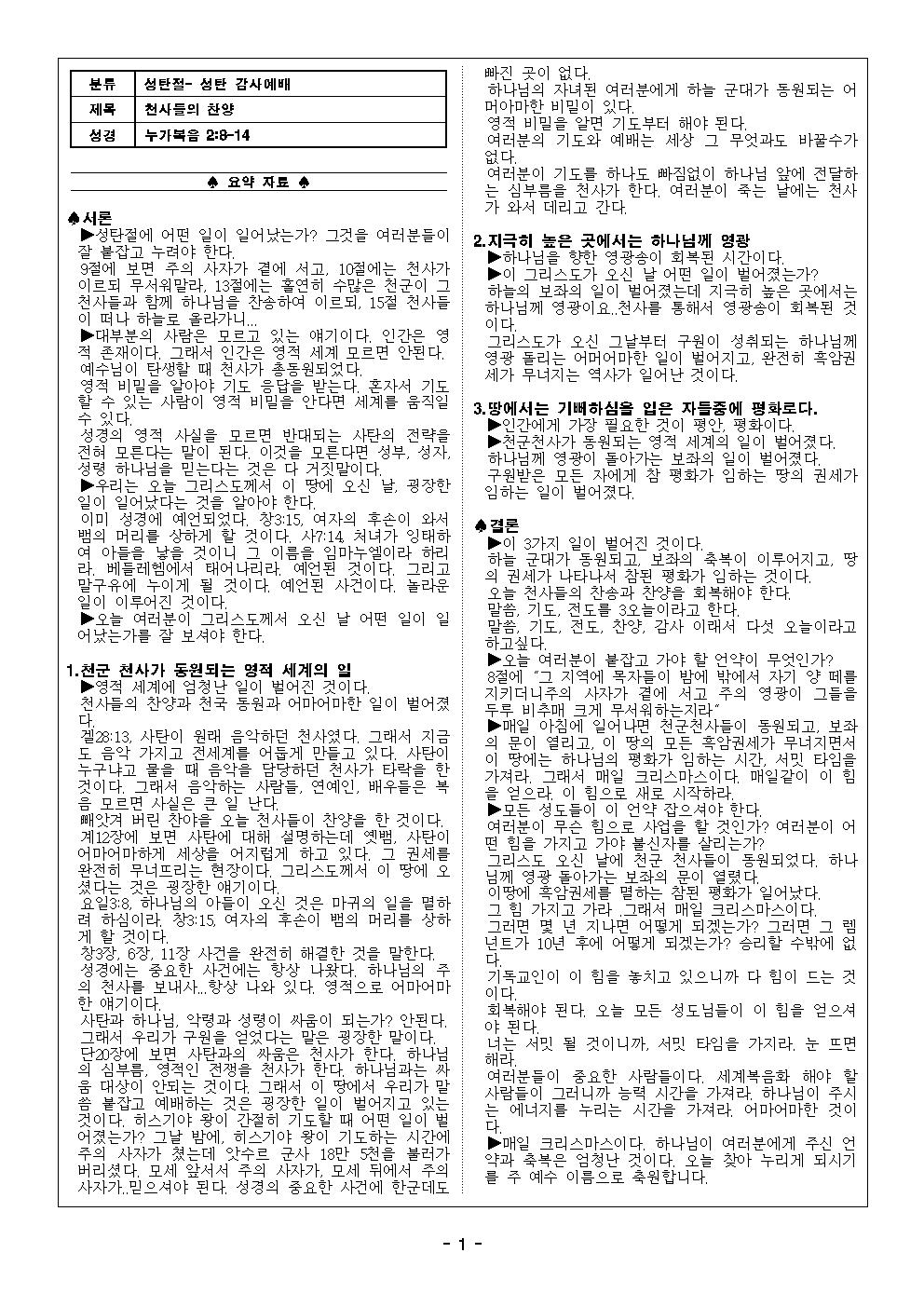 9절에 보면 주의 사자가 곁에 서고, 10절에는 천사가 이르되 무서워말라, 13절에는 홀연히 수많은 천군이 그 천사들과 함께 하나님을 찬송하여 이르되, 15절 천사들이 떠나 하늘로 올라가니...