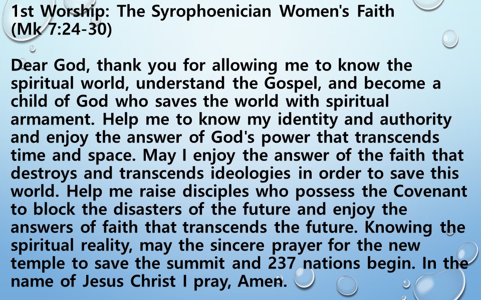 Dear God, thank you for allowing me to know the spiritual world, understand the Gospel, and become a child of God who saves the world with spiritual armament. Help me to know my identity and authority and enjoy the answer of God's power that transcends time and space. May I enjoy the answer of the faith that destroys and transcends ideologies in order to save this world. Help me raise disciples who possess the Covenant to block the disasters of the future and enjoy the answers of faith that transcends the future. Knowing the spiritual reality, may the sincere prayer for the new temple to save the summit and 237 nations begin. In the name of Jesus Christ I pray, Amen.
