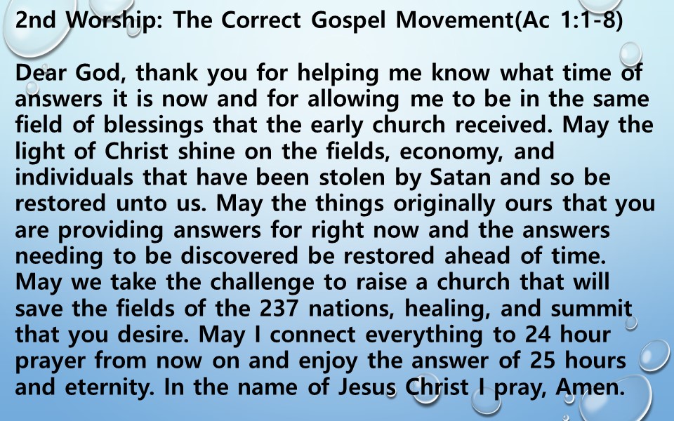 Dear God, thank you for helping me know what time of answers it is now and for allowing me to be in the same field of blessings that the early church received. May the light of Christ shine on the fields, economy, and individuals that have been stolen by Satan and so be restored unto us. May the things originally ours that you are providing answers for right now and the answers needing to be discovered be restored ahead of time. May we take the challenge to raise a church that will save the fields of the 237 nations, healing, and summit that you desire. May I connect everything to 24 hour prayer from now on and enjoy the answer of 25 hours and eternity. In the name of Jesus Christ I pray, Amen.