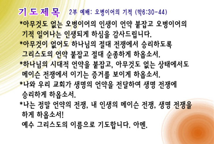2부 예배: (성전건축헌신예배) 오병이어의 기적 (막6:30-44)