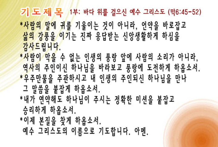 1부 예배: 바다위를 걸으신 예수 그리스도 (막6:45-52)