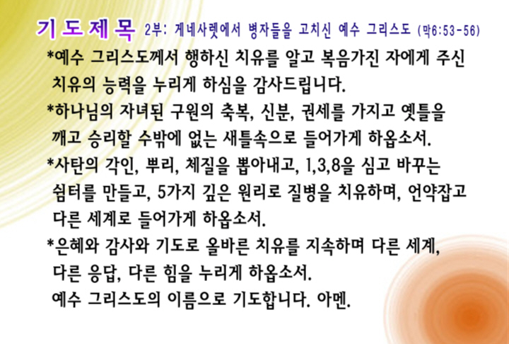 2부 예배: 게네사렛에서 병자들을 고치신 예수 그리스도 (막6:53-56)