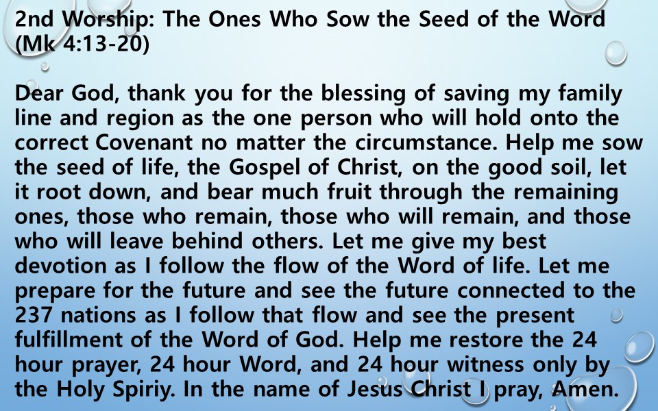 Dear God, thank you for the blessing of saving my family line and region as the one person who will hold onto the correct Covenant no matter the circumstance. Help me sow the seed of life, the Gospel of Christ, on the good soil, let it root down, and bear much fruit through the remaining ones, those who remain, those who will remain, and those who will leave behind others. Let me give my best devotion as I follow the flow of the Word of life. Let me prepare for the future and see the future connected to the 237 nations as I follow that flow and see the present fulfillment of the Word of God. Help me restore the 24 hour prayer, 24 hour Word, and 24 hour witness only by the Holy Spiriy. In the name of Jesus Christ I pray, Amen.
