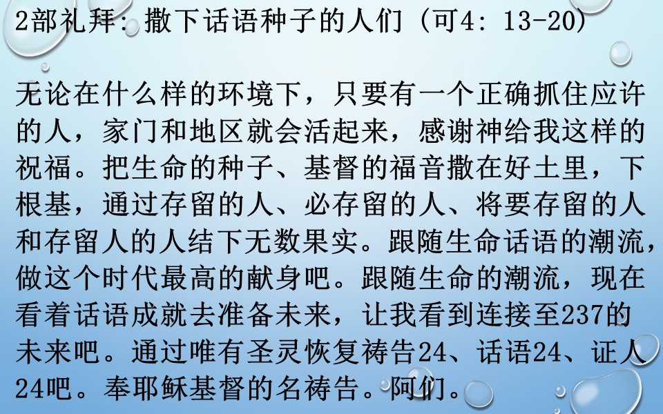 无论在什么样的环境下,只要有一个正确抓住应许的人,家门和地区就会活起来,感谢神给我这样的祝福。把生命的种子、基督的福音撒在好土里,下根基,通过存留的人、必存留的人、将要存留的人和存留人的人结下无数果实。跟随生命话语的潮流, 做这个时代最高的献身吧。跟随生命的潮流,现在看着话语成就去准备未来,让我看到连接至237的未来吧。通过唯有圣灵恢复祷告24、话语24、证人24吧。奉耶稣基督的名祷告。阿们。