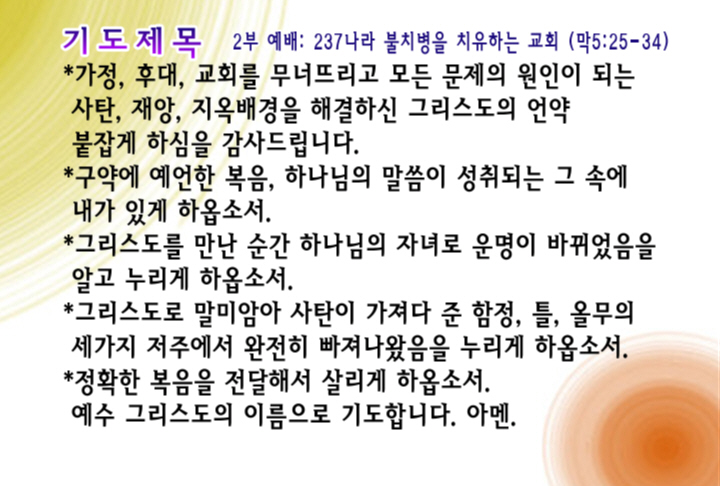 2부 예배: 237나라 불치병을 치유하는 교회 (막5:25-34)