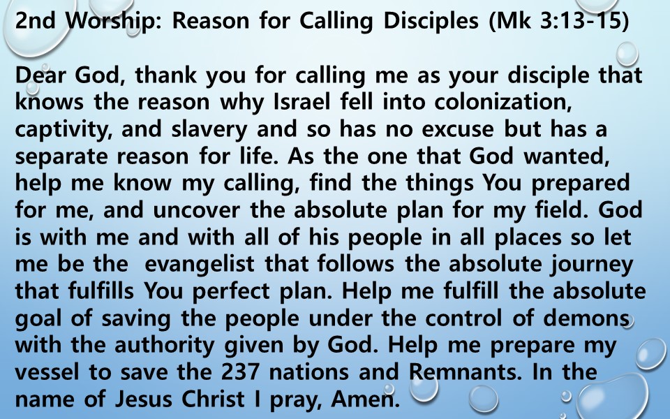 Dear God, thank you for calling me as your disciple that knows the reason why Israel fell into colonization, captivity, and slavery and so has no excuse but has a separate reason for life. As the one that God wanted, help me know my calling, find the things You prepared for me, and uncover the absolute plan for my field. God is with me and with all of his people in all places so let me be the  evangelist that follows the absolute journey that fulfills You perfect plan. Help me fulfill the absolute goal of saving the people under the control of demons with the authority given by God. Help me prepare my vessel to save the 237 nations and Remnants. In the name of Jesus Christ I pray, Amen.