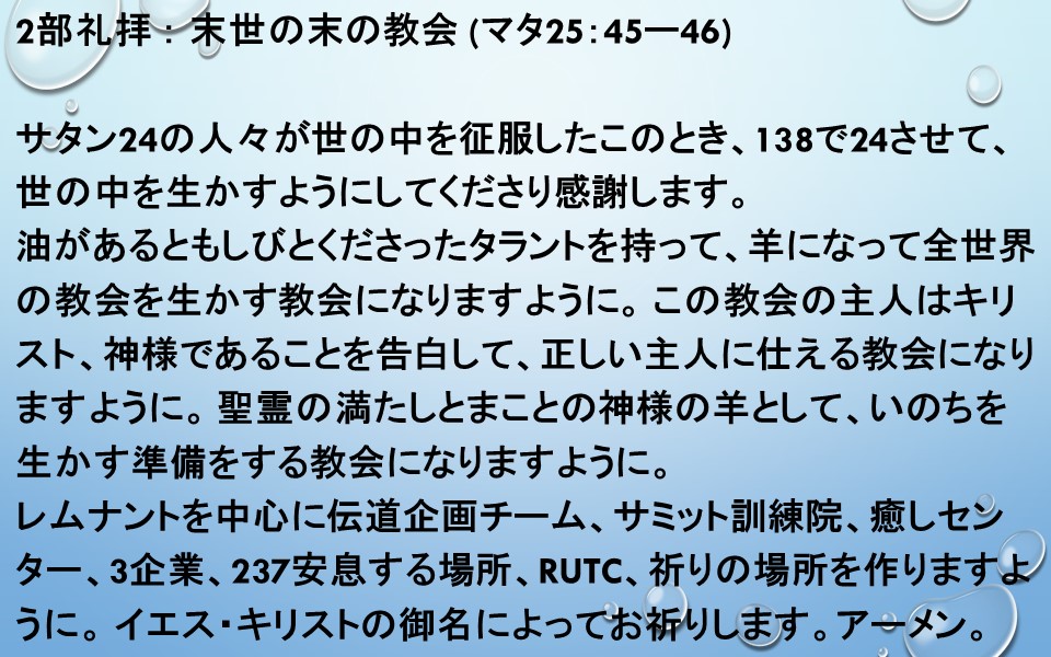 2部礼拝 : 末世の末の教会 (マタ25:45ー46)