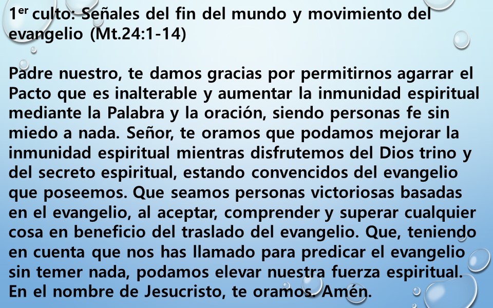 1er culto: Señales del fin del mundo y movimiento del evangelio (Mt.24:1-14)
